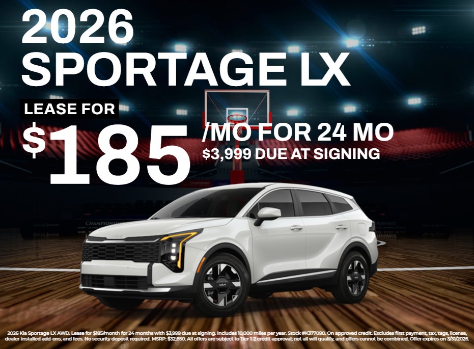 2026 Kia Sportage LX AWD. Lease for $185/month for 24 months with $3,999 due at signing. Includes 10,000 miles per year. Stock #K377090. On approved credit. Excludes first payment, tax, tags, license, dealer-installed add-ons, and fees. No security deposit required. MSRP: $32,650. All offers are subject to Tier 1-2 credit approval; not all will qualify, and offers cannot be combined. Offer expires on 3/31/2026.